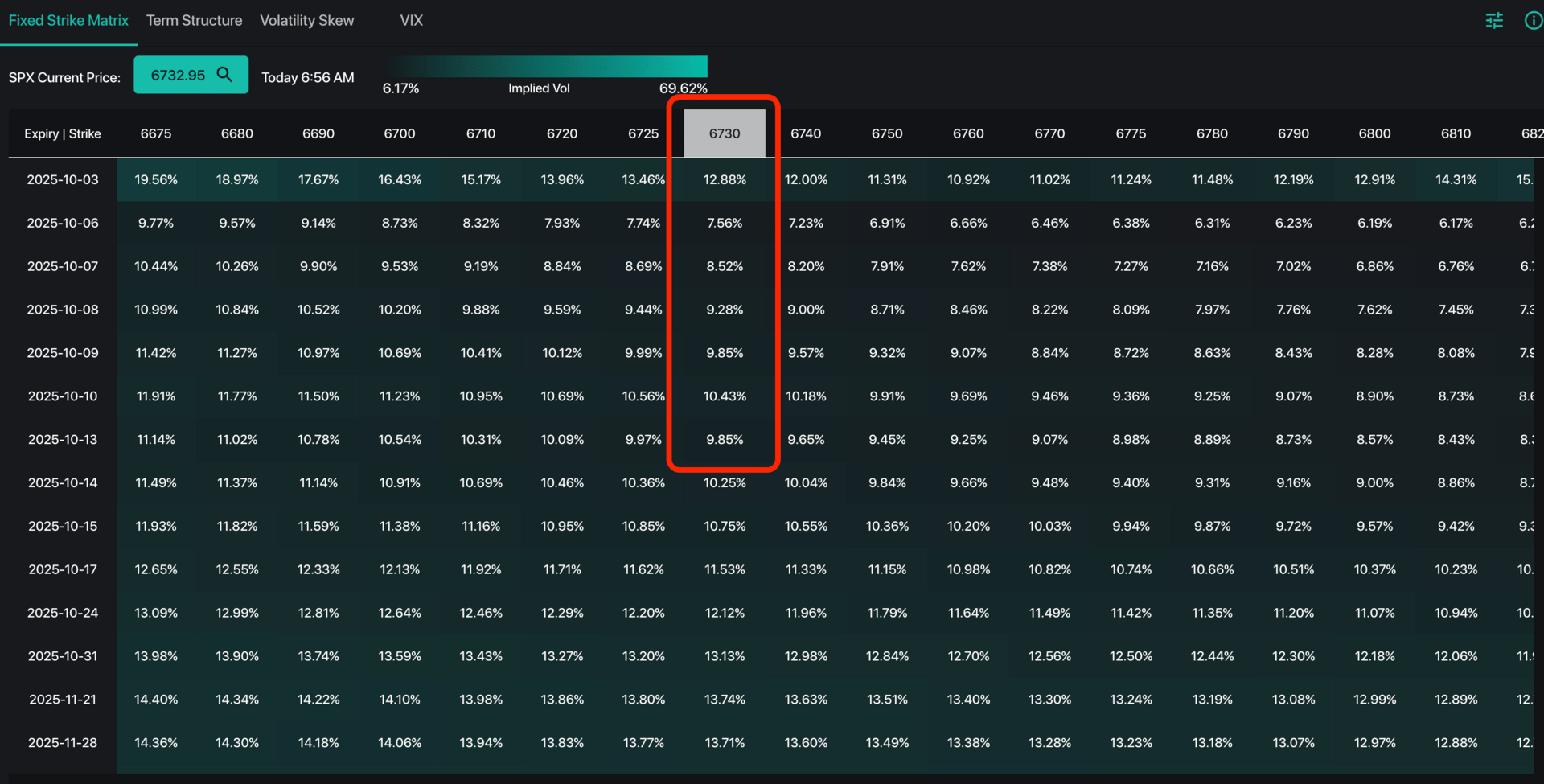 Below is SPX IV, and we see that while VIX remains >16, short dated SPX vols are in the gutter at <10%. Its possible the Shutdown keeps a bid into >1-month vol/VIX, but what seems clearest here is that there is just a IV kink at October OPEX (IV is < before OPEX and > after).