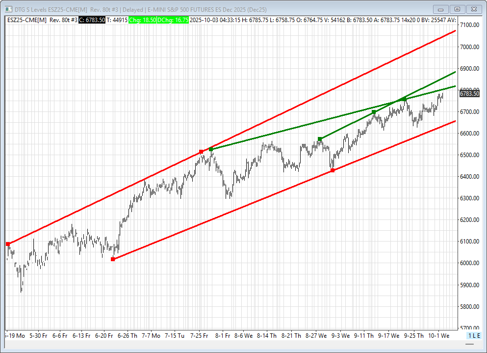 What did the ES do yesterday? It made another new high on Globex at 6782.75, traded 6757.00 on the 9:30 regular session open, sold off down to 6741.50 at 11:35, rallied up to the 6776 area at 1130, and then started to drift lower down to the 6762 area. It traded back up to the 6768 level at 3:00 and traded 6764 at 3:45.