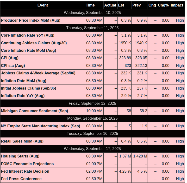 Fed in Focus: Markets are pricing in a rate cut next week following weaker labor data. Tomorrow’s PPI and Thursday’s CPI will be critical.