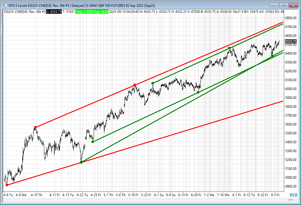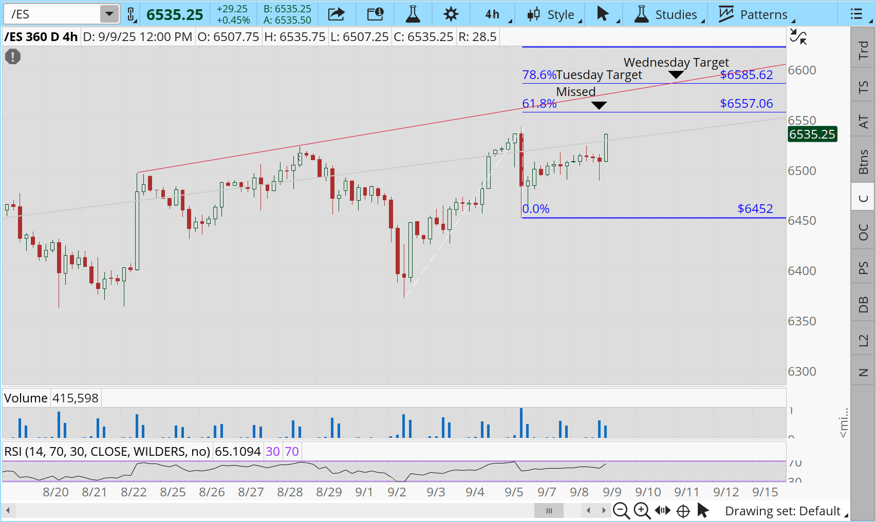 Prior Session was Cycle Day 2: This cycle day saw normal rhythmic oscillations as price rotated with stunning precision between the upper and lower target zones outlined in the prior DTS Briefing 9/9/25.