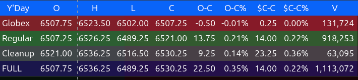 Cleanup trade added modestly to the upside, closing at 6530.25, bringing the full-session net to +22.50 points (+0.35%) with total volume of 1.11 million contracts.