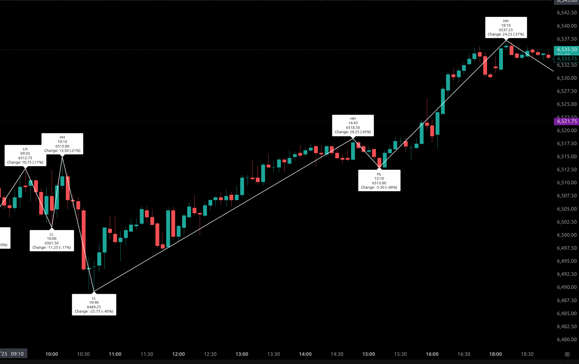 The cash session opened at 6507.25 and initially extended higher, reaching 6515.00 at 10:10 AM. Sellers then gained traction, dragging the ES down to the regular-session low of 6489.25 at 10:40 AM. That marked the inflection point of the day, as buyers stepped in with steady conviction. A broad-based rally unfolded through midday, carrying futures back to 6518.50 at 2:45 PM. After a brief dip to 6513.00 at 3:10 PM, another late push drove the ES to the regular-session high of 6526.25 at 3:50 pm. The contract settled at 6521.00, up 13.75 points (+0.21%) on the day, a gain of 14.00 points or +0.22% from the prior cash close.