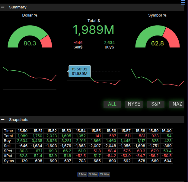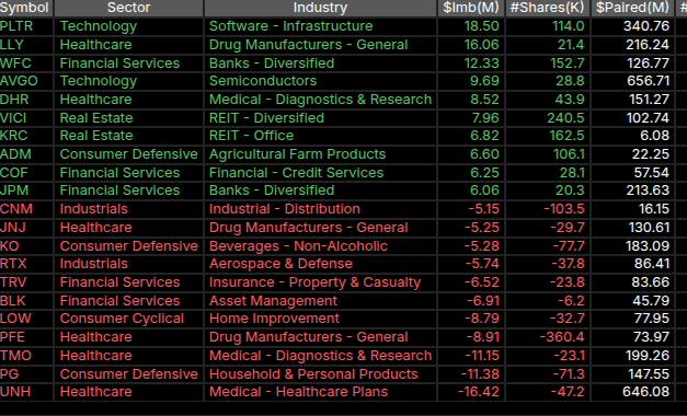 Market tone leaned constructive. After early weakness, the afternoon rally revealed strong dip-buying interest, particularly into the close. The Market-on-Close imbalance monitor showed a $1.99 billion buy imbalance at 3:50 PM, with 80.3% of notional skewed to the buy side and 62.8% of symbols favoring buyers. This notable imbalance supported the late-session push into the day’s highs. Sector flows showed heavy buy imbalances in technology (PLTR, AVGO) and financials (WFC, JPM), while notable sell pressure came from healthcare names such as UNH and PFE.