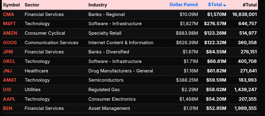 Sector flows told a more nuanced story. Industrials, Technology, Real Estate, and Consumer Cyclical all posted strong positive dollar totals, each with buy leans north of 64%, indicating sustained demand beneath the surface. Technology stood out as both highly active and strongly bid, reinforcing its leadership role into the close. Basic Materials and Communication Services also leaned decisively higher, consistent with risk-on allocation.