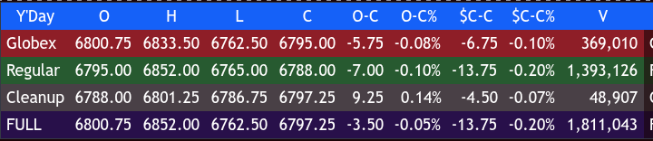 The ES then sold off down to 6782.00 at 3:45 and traded 6785.25 as the 3:50 cash imbalance showed 1.1B. It traded up to 6789.75, sold back off down to 6779.50 at 3:55, and traded 6788.00 on the 4:00 cash close.