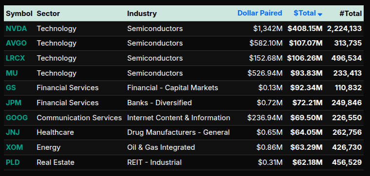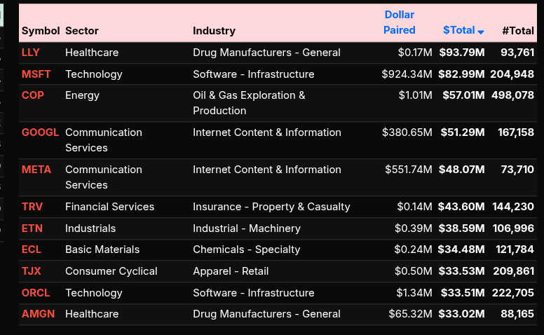 At the symbol level, the largest sell imbalances were concentrated in LLY, MSFT, COP, GOOGL, and META. On the buy side, NVDA led with over $408M paired, followed by AVGO, LRCX, MU, GS, JPM, GOOG, JNJ, XOM, and PLD. The strong presence of semiconductors and financials on the buy list reinforced the broader institutional bid that dominated most of the imbalance window before the final auction balanced out.