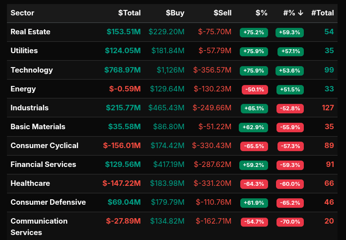 Conversely, several sectors showed distribution. Consumer Cyclical (–65.5%), Healthcare (–64.3%), and Communication Services (–54.7%) leaned toward selling pressure, although these readings were closer to rotational flows rather than outright liquidation.