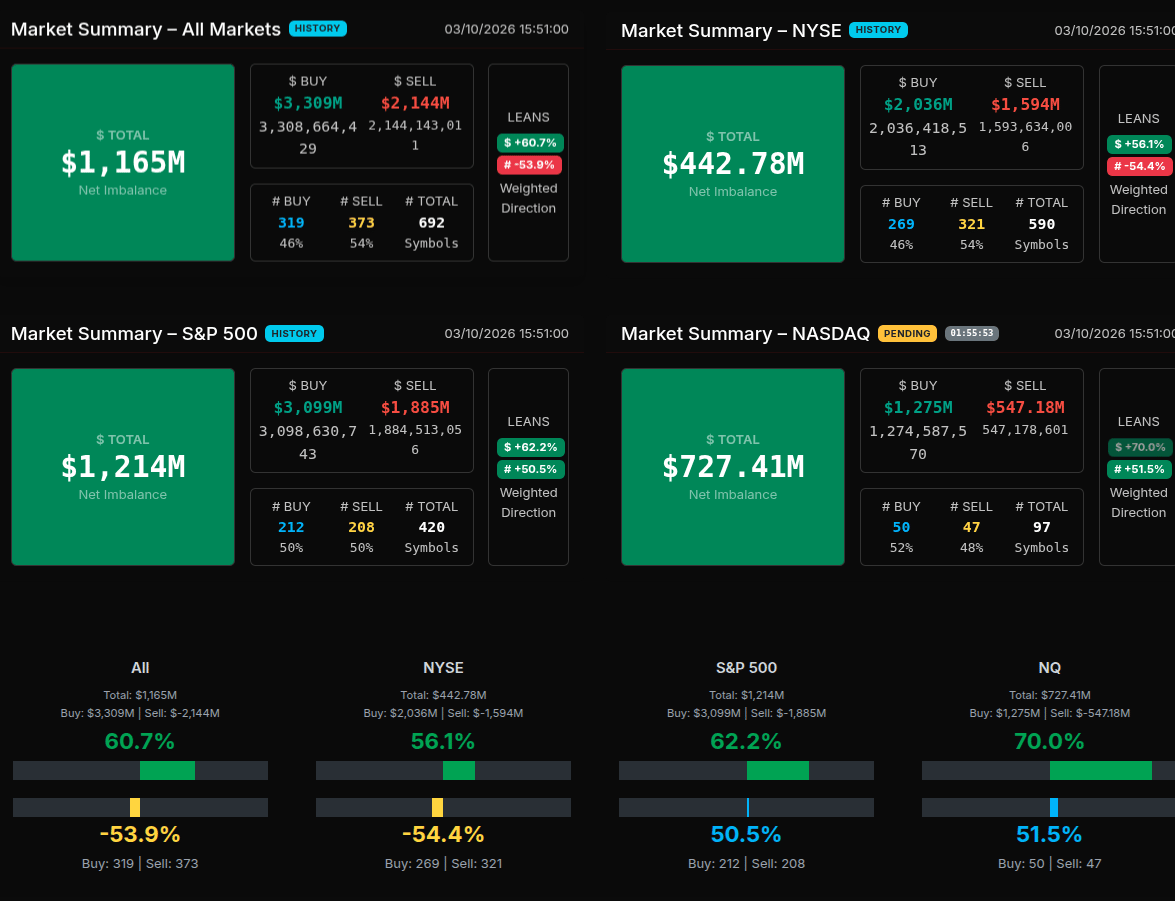 The closing auction on March 10 developed with a clear buy-side bias early in the imbalance window before gradually rotating into a more balanced finish. At 15:50, the market opened with a modest $4M net buy imbalance, but the tone quickly strengthened as buy interest surged. By 15:51, the imbalance expanded sharply to $1.165B with buy orders reaching $3.3B against $2.14B in sells, setting the stage for a buy-leaning close. The imbalance continued to build into 15:53 where it peaked near $1.98B as buy orders approached $4B. During this phase the percentage lean reached roughly 66.5%, signaling a strong directional institutional bid rather than simple rotation.