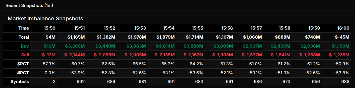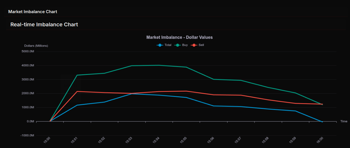 After that peak, the imbalance began to steadily contract. From 15:55 onward both buy and sell liquidity declined, with buy interest fading faster than earlier in the window. The total imbalance compressed from $1.7B to under $750M by 15:59 before flipping slightly negative into the close at –$45M. This late shift suggests closing cross participation absorbed most of the earlier demand, leaving the auction balanced at the final print.