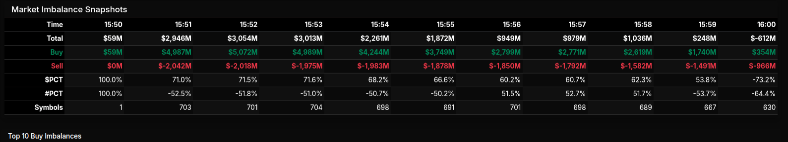 From 15:50 to 16:00, the total imbalance climbed sharply from just $59M to $3.05B, peaking near 15:52 before gradually fading into the close as paired-off volume increased. The decline into the bell was mechanical, typical of order matching, not sentiment reversal. Technology names dominated participation, accounting for more than half of total imbalance value.