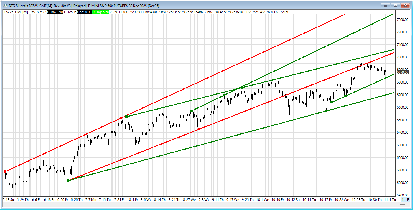 If you look at the daily net changes over the last 9 sessions (Oct 21–31), the NQ has risen 6 out of 8 sessions (75%) for a total gain of +2.80%, while the ES has been up 5 out of 8 sessions (62.5%) for a total gain of +1.49%. The NQ has been the clear leader on both up and down days and in net changes.