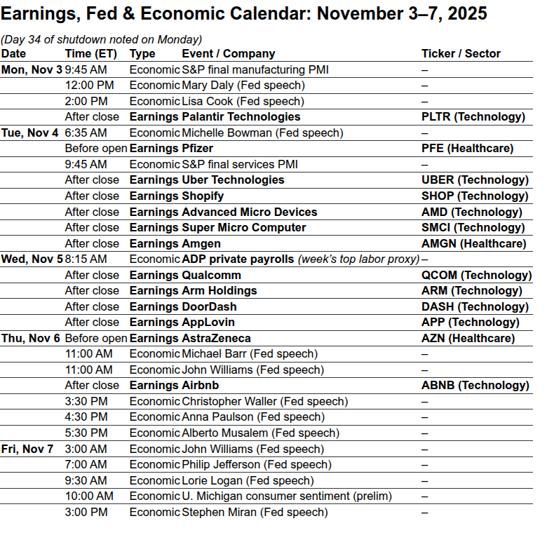 What’s the old saying? There is no rest for the wicked? I told the PitBull, there’s no way anyone can keep up with all the news. It’s gotten so out of hand it’s unimaginable—and adding to it, this week features 135 S&P 500 companies reporting. According to FactSet, more than 300 S&P 500 companies have posted third-quarter results so far. Of those, over 80% have beaten expectations—and another 100-plus report this week, including key AI and tech names.