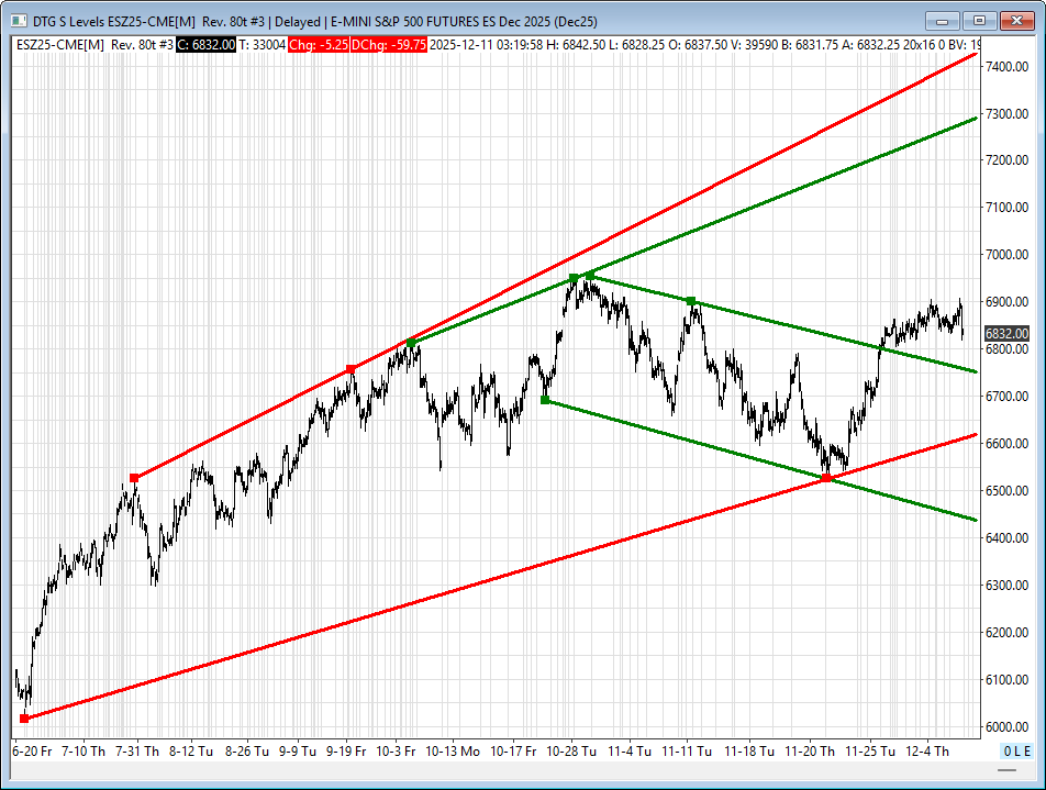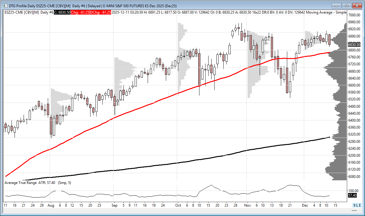 The ES fell sharply on Globex down to 6817.25, down over 1%, and the NQ traded down to 25,383.00, down over 1.5%. There was some news of a massive Ukrainian drone attack on Moscow, but I don't think that was the driver. I think it was the Fed's sea change on lowering rates in 2026. While I didn't see this coming, it makes sense. As I have always said, the S&P hates uncertainty.