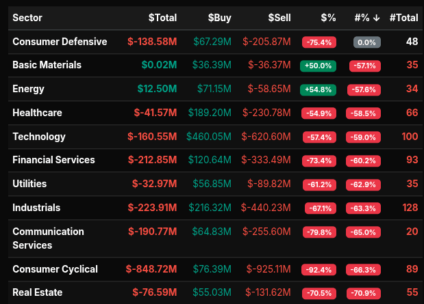 Market tone was mixed: constructive into late morning, then two-way and ultimately heavy into the close as repeated failures at 6841 capped advances. The Market-on-Close data showed a strong dollar sell imbalance at –$1.914B with weighted direction at –61.3%. The right‑meter symbol mix (39% buy / 61% sell) did not breach the ±66% “notable” threshold, but the dollars were clearly one-sided, especially in NQ (–75.6%) and S&P 500 (–72.0%). Sector flows skewed defensive: the heaviest outflows were Consumer Cyclical (–$848.7M), Industrials (–$223.9M), and Financials (–$212.8M), while Energy (+$12.5M) and Basic Materials (+$0.02M) were marginal positives.
