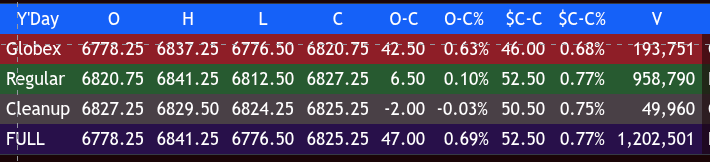 The Cleanup session added little directional change, opening at 6827.25, peaking briefly at 6829.50, and closing flat at 6825.25 on light volume (49,960). Across all sessions, total volume reached just over 1.2 million contracts.