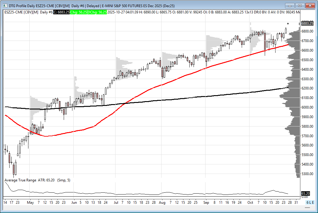 Despite the closing sell imbalance, the ES managed to hold gains on the day. The overall tone remains cautiously bullish, with traders eyeing follow-through above 6840 for potential continuation, while 6810–6815 remains near-term support. With volatility compressing and imbalances heavy to the sell side, short-term participants appear to be rotating capital defensively ahead of key economic releases later in the week.