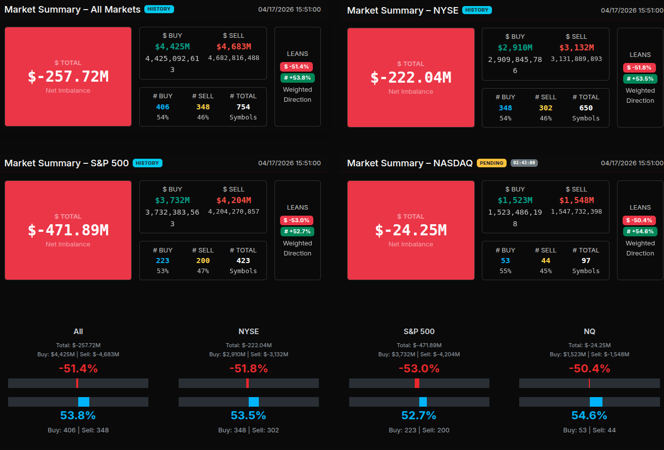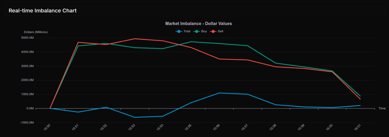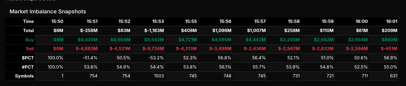 From 15:55 onward, the market began absorbing supply and rotating back toward the buy side. Imbalances flipped positive and built steadily, peaking around 15:56–15:57 with over $1B in buy-side pressure. Importantly, the percentage leans during this phase hovered in the low-to-mid 50% range, signaling rotational buying rather than a wholesale institutional sweep. The close itself maintained a modest buy skew, finishing near +56.9%, reinforcing that the late demand was controlled accumulation, not aggressive chasing.