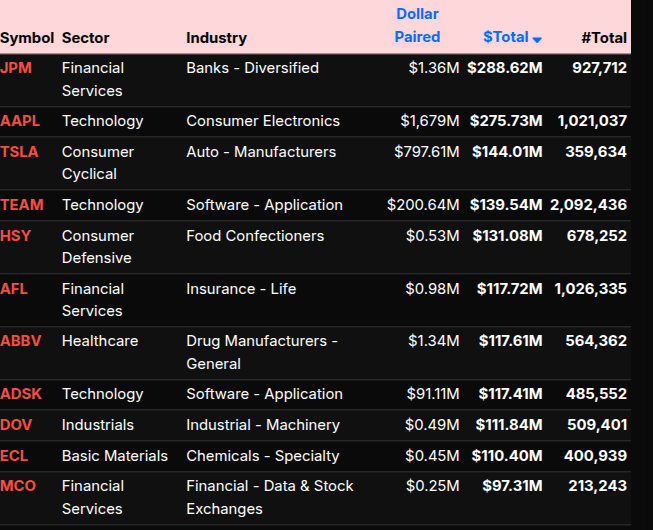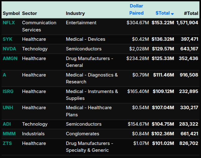 At the symbol level, buying was concentrated in names like NFLX, NVDA, and AMGN, while selling pressure was evident in Financials (JPM, MCO) and Consumer names (TSLA, HSY).