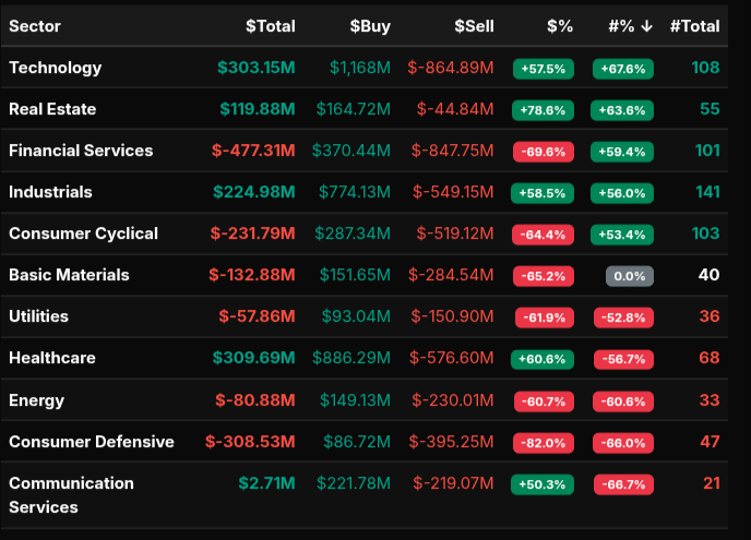On a sector level, dispersion was significant. Technology (+57.5%) and Healthcare (+60.6%) showed strong buy-side participation, with Healthcare particularly notable given its negative breadth (-56.7%), indicating concentrated institutional buying in fewer names. Real Estate led all sectors at +78.6%, a clear wholesale buy signal. Industrials (+58.5%) also contributed meaningfully to the upside rotation.
