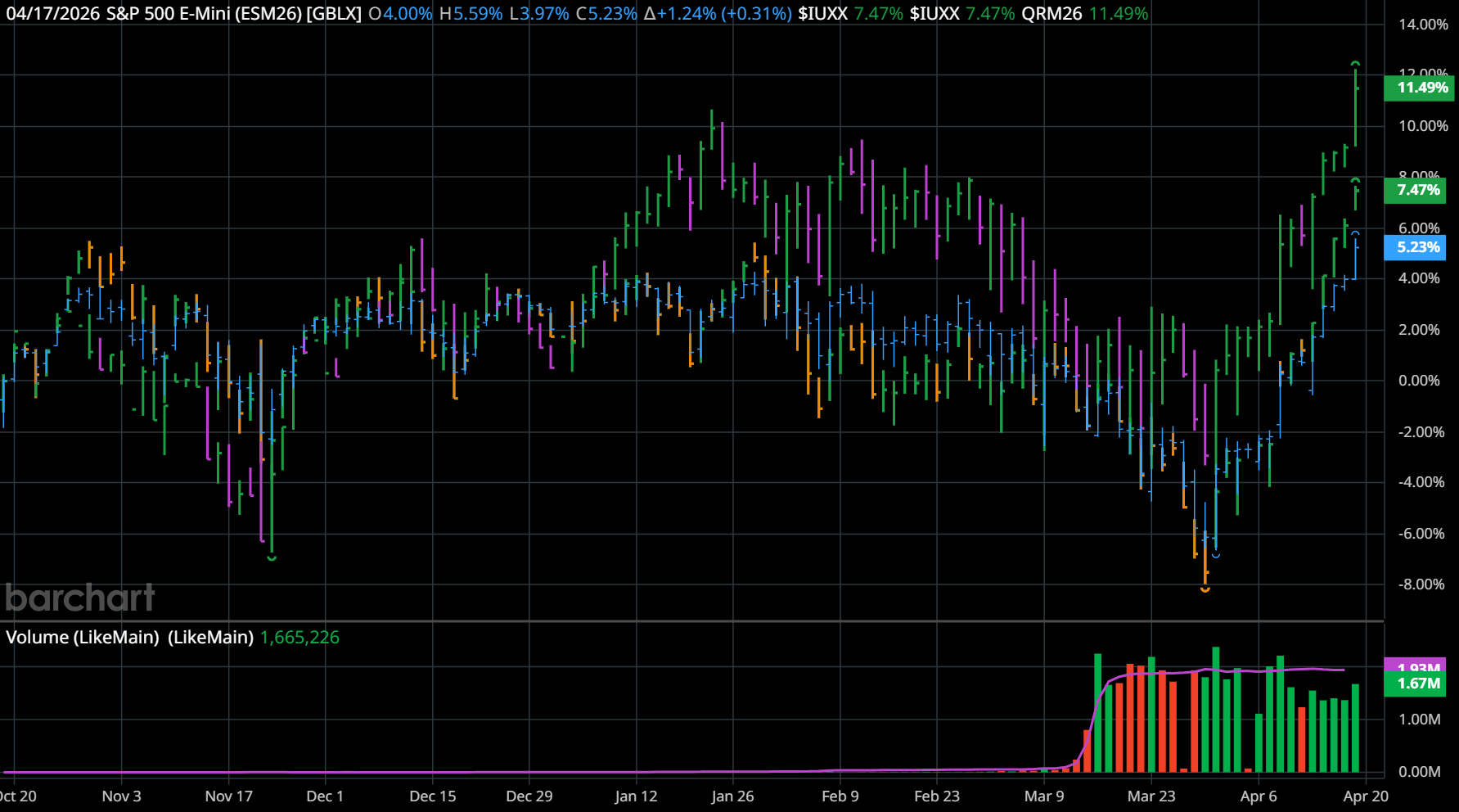 After 4:00, the ES traded up to 7166.25 and settled at 7164.25, up 84.50 points or +1.9%; the NQ settled at 26,825.50, up 388.25 points or +1.18%; the YM settled at 48,808, up 874 points or +1.79%; and the RTY, or QRM26, settled at 2,788.90, up 58.10 points or +2.13%. The YM is the only major index that didn't cross its all-time high; it settled at 49,410 on February 10.