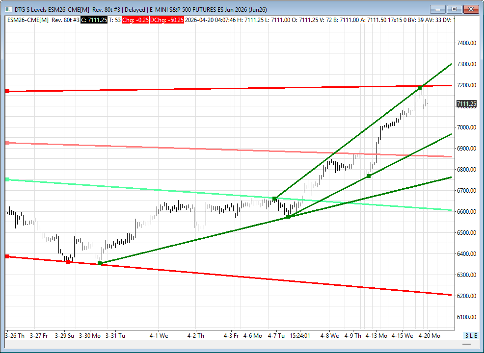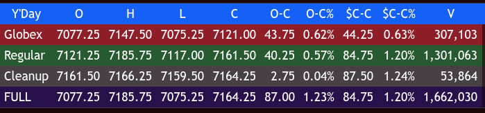 After the open, the ES traded 7119.25, rallied up to 7130.75, sold off down to 7117.00 at 9:45, and rallied 57.75 points up to 7174.75 at 10:50. It then sold off down to 7163.00 at 11:00, rallied up to a lower high at 7173.00, and sold off down to 7159.50 at 11:15. The ES rallied 26.25 points up to 7185.75 at 12:45, then sold off 34.25 points down to 7151.50 at 1:20.