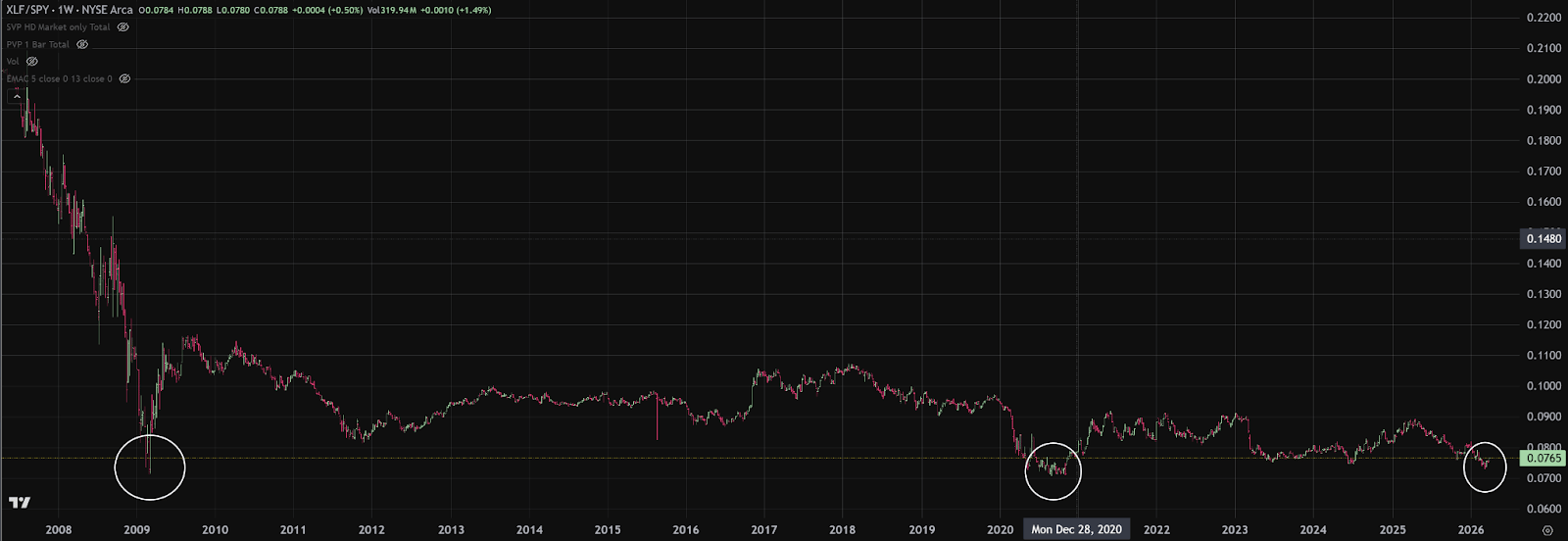 The XLF/SPY ratio is approaching a level that has only been seen during periods of significant market stress—most notably the 2008 financial crisis and the 2020 COVID shutdown.